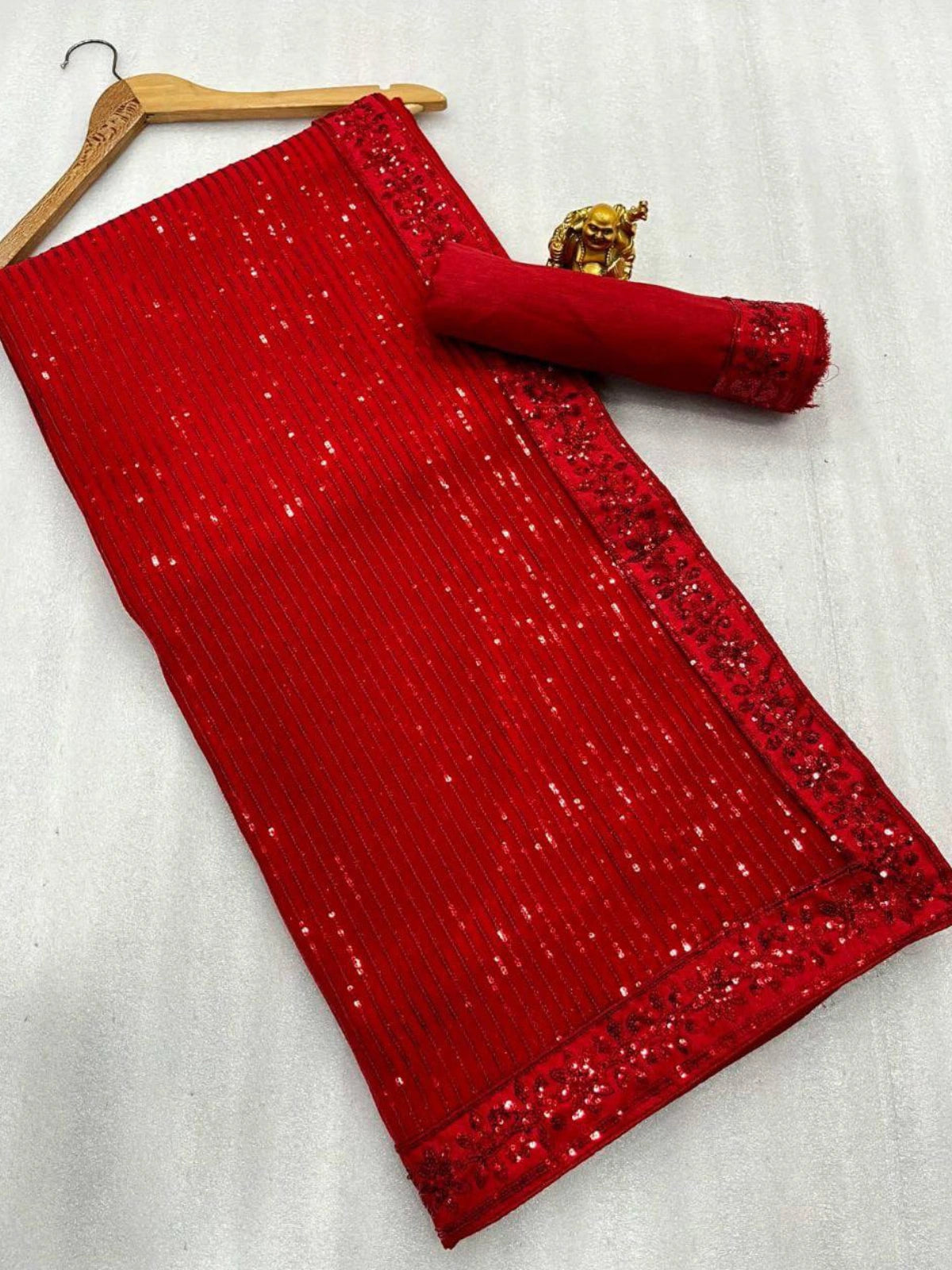 Step into timeless elegance with this Bollywood-inspired red saree. Crafted from premium heavy georgette, it features shimmering sequin embroidery that adds a touch of glamour and grace. Perfect for festive occasions or evening events, this saree captures the classic charm of a true Bollywood diva.