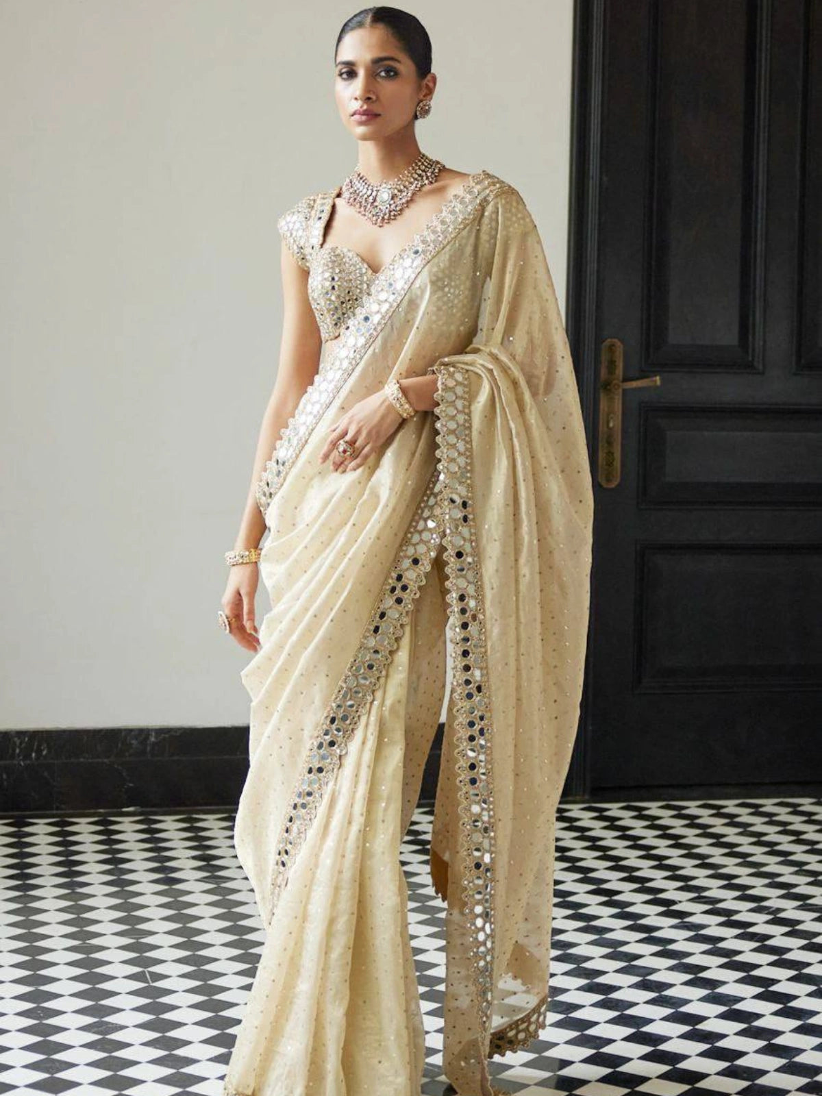 Saree Design: Subtle yet glamorous Bollywood-inspired design with scattered mirror work that enhances elegance