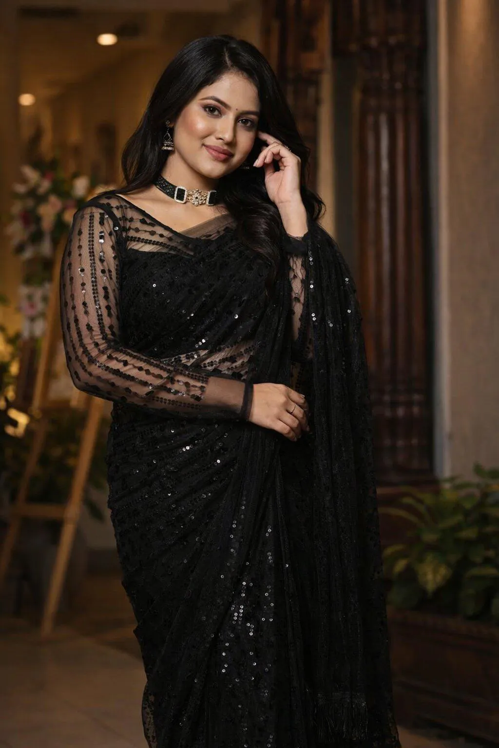 Step into timeless elegance with this stunning black net saree, beautifully adorned with intricate sequin and thread embroidery in floral and geometric patterns. The lightweight net fabric gives a sheer, graceful drape, while the sparkling sequins add just the right amount of glamour. Finished with a chic tassel border, this saree is perfect for evening parties, cocktail functions, receptions, or festive occasions. Pair it with a matching blouse for a bold look or contrast it with a metallic shade to stand out.