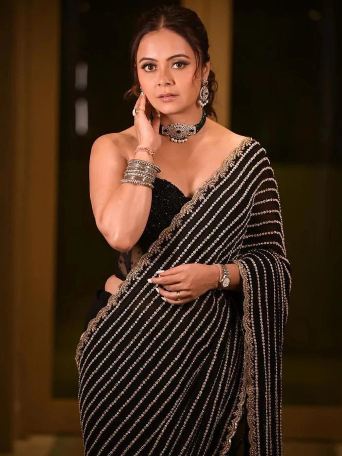 | Styling Tip: | Team it with gold statement earrings, sleek hair, and bold eyes for a celebrity-style appearance. |
