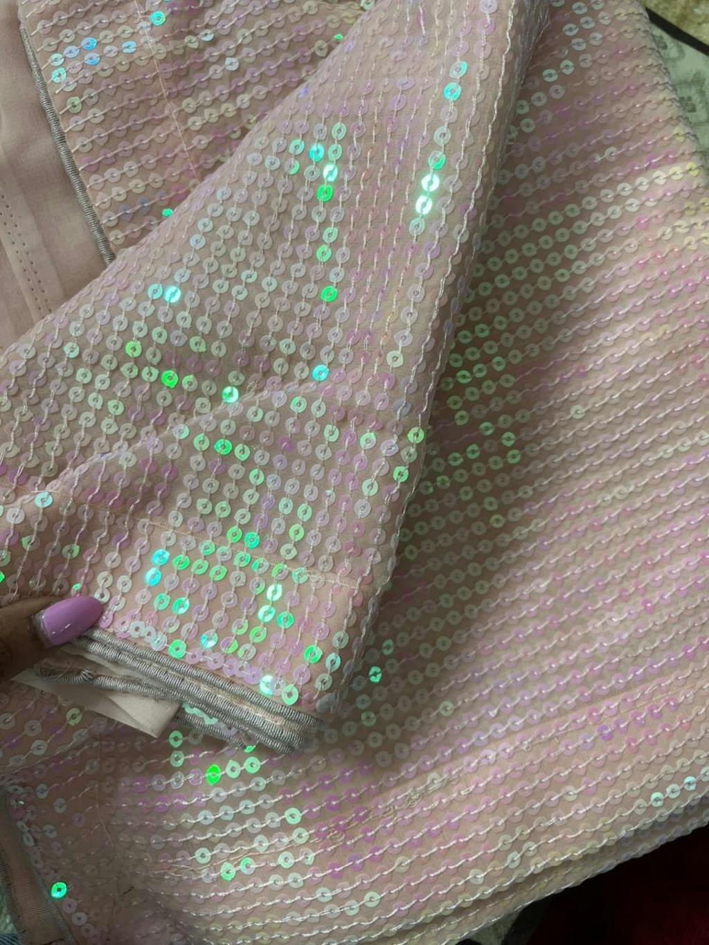 The image showcases a woman exuding grace and elegance in a beautifully draped, shimmering pink saree. The soft pastel hue paired with subtle sequins enhances her radiant look, while her flowing hair and warm smile add a touch of natural charm. The minimal jewelry and refined styling highlight the saree’s sophistication, making the overall appearance both glamorous and timeless.