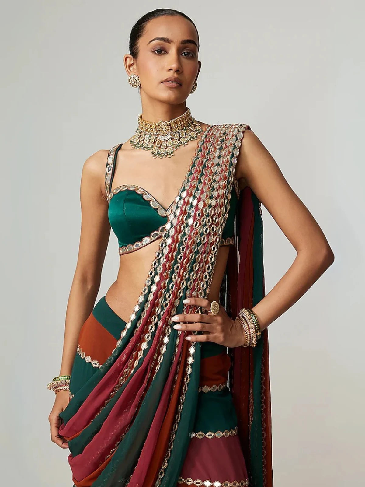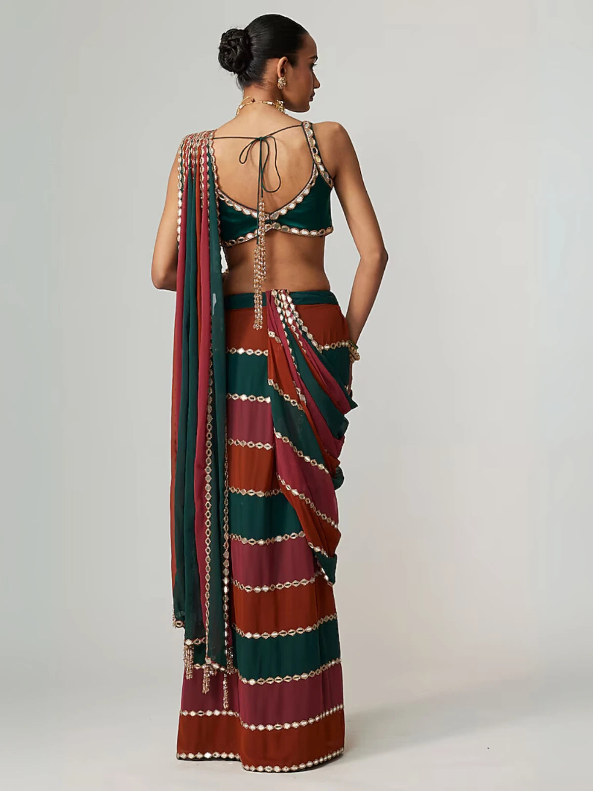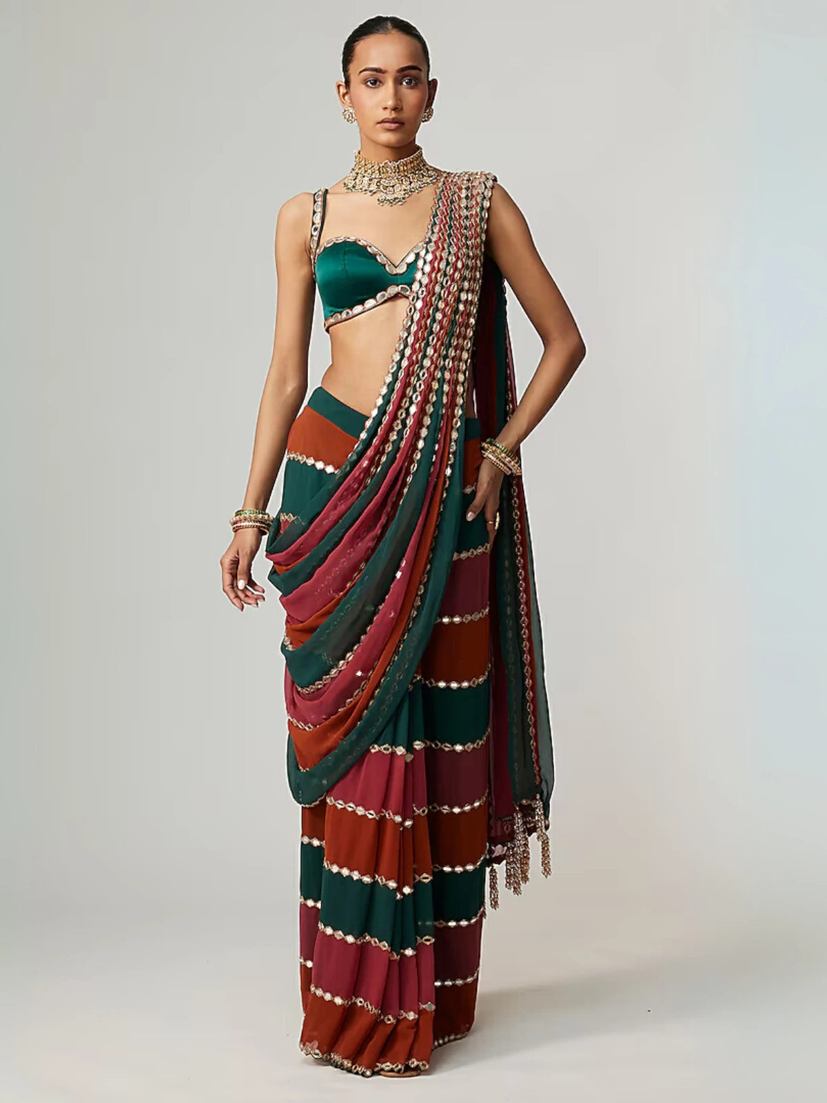 Turn heads with this stunning Multi-Colored Georgette Saree Set, beautifully highlighted with mirror embroidery and vibrant striped patterns. Designed with rich festive hues, this saree comes with a stylish matching blouse, making it a perfect blend of tradition and glamour. Lightweight and elegant, it’s an ideal choice for weddings, festive occasions, and grand celebrations.