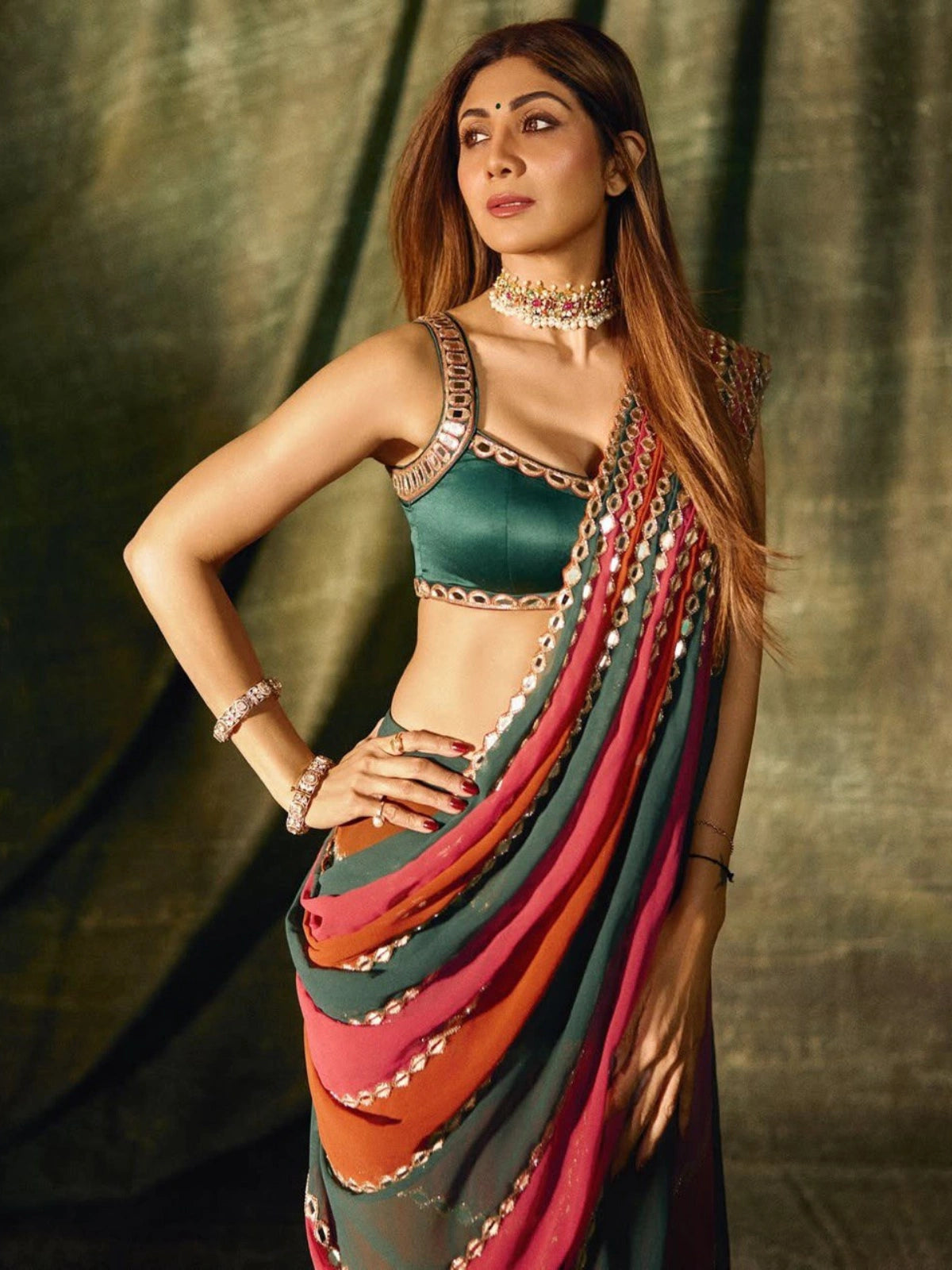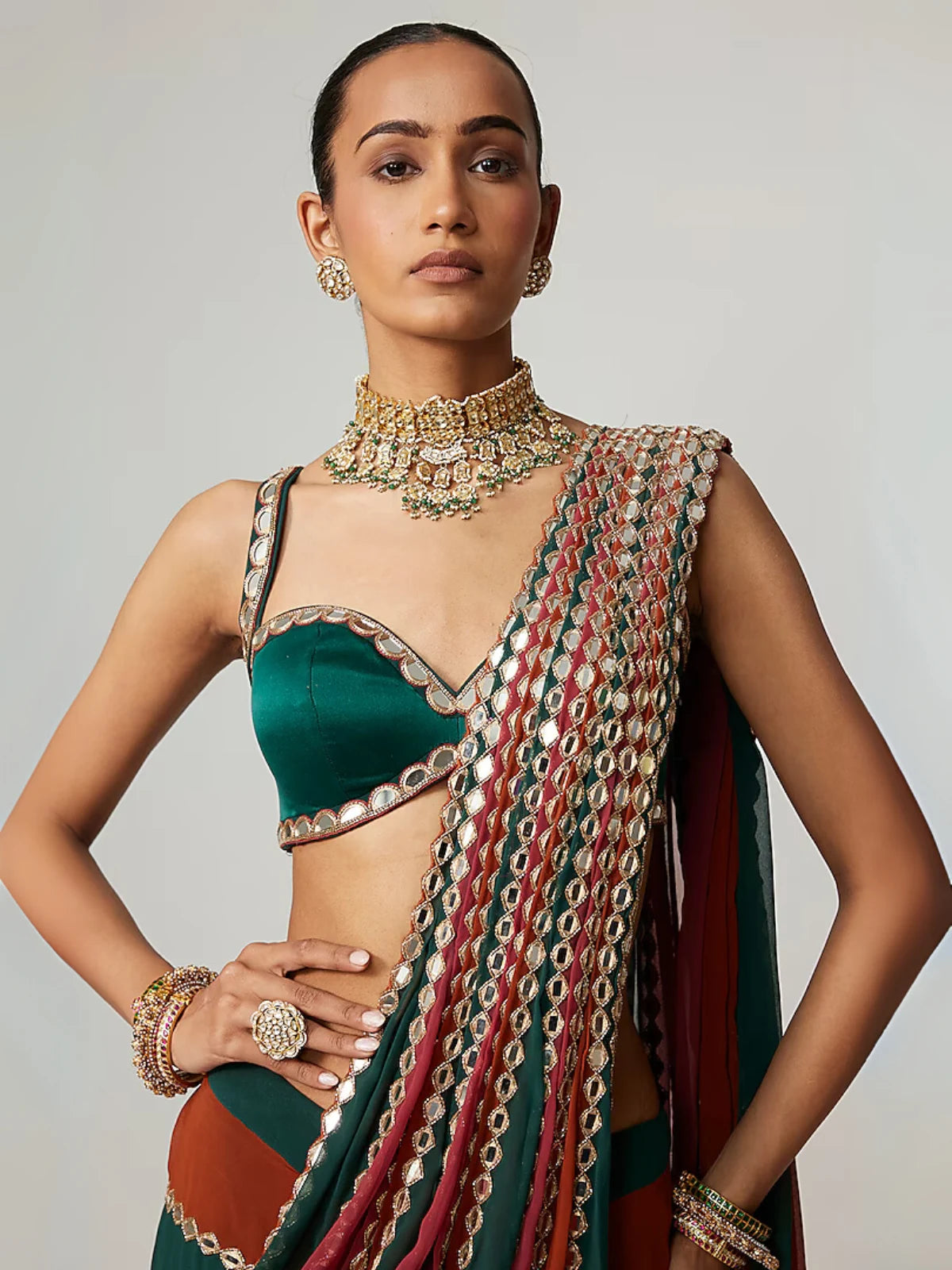 | Fabric: | Premium georgette with vibrant multicolour finish and mirror embroidery |