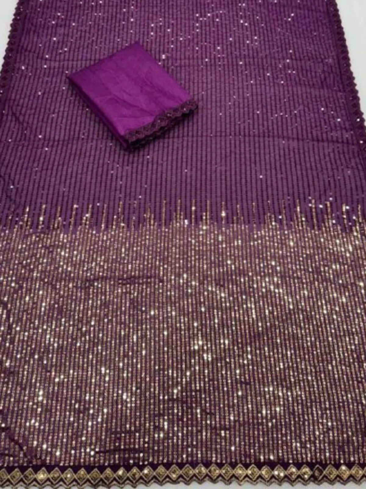 Make a statement with this stunning wine-colored sequin saree, designed for elegance and glamour. The gold sequin border adds a royal touch, perfect for weddings, parties, and festive celebrations. Crafted with premium fabric, this Bollywood-inspired look ensures you shine on every occasion. Pair it with statement jewelry for the ultimate red-carpet style.