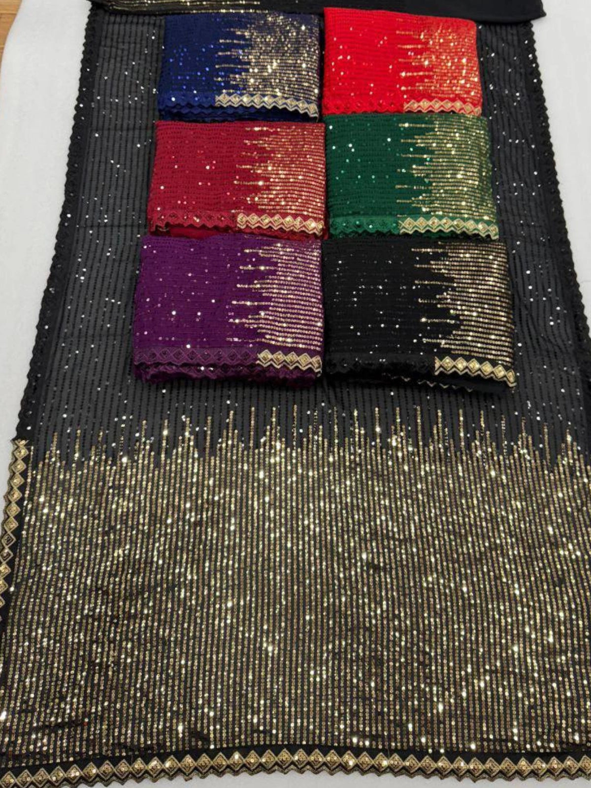 | Fabric: | Premium georgette with sequin finish and shimmering border |
